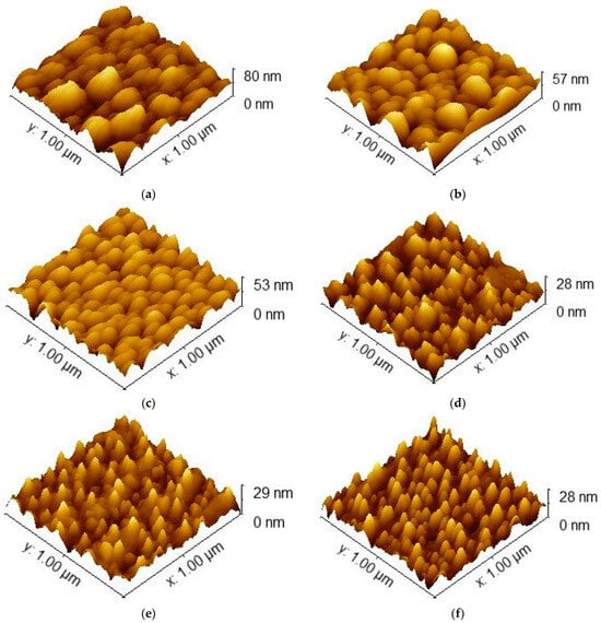 AFM images determining the structural roughness of ITO-nanorod deposited on glass substrate treated with oxygen plasma under different conditions of oxygen gas supply: (a) ASD; (b) 20 sccm; (c) 40 sccm; (d) 60 sccm; (e) 80 sccm; (f) 100 sccm.