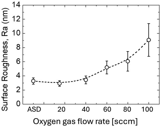 where the Gaussian function value is , a is the mean value, the standard deviation is , and X is the diameter measurement of each grain in nanometers. Figure 9 illustrates the relationship graph from the calculation of the diameter and length of ITO-nanorod, which compares the samples between ASD film and ITO-nanorod treated with oxygen plasma. Looking in more detail at Figure 9, the graph shows that at flow rates of 20–80 sccm, the nanorod sizes are quite similar, and when the flow rate is increased to 100 sccm, the oxygen plasma concentration is the highest, which causes the highest plasma energy to break the bonds of the ITO surface. For this, the nanorod size is the smallest compared to other conditions. The results exhibit that the adjustment of oxygen gas flow rate in the plasma process affects the change in the size of the nanorods, with the length of ITO-nanorods ranging from 208 to 213 nm. When considering the size of the nanorods in the blue graph at different oxygen gas flow rates, it was found that when the oxygen gas flow rate increased, the nanorod size gradually decreased. This can be explained by the fact that as the oxygen plasma ion concentration increases, the neutral gas molecules or atoms and the excited gas molecules and atoms will have a large amount of internal energy. When these molecules, ions, and atoms come together, they interact with the ITO-nanorod surface, resulting in well-separated nanorod structures because of the shadowing effect [42]. This causes the gas atoms to fall onto the support and not aggregate into a film layer, resulting in separated and smaller ITO-nanorod structures [43,44]. Similarly, the nanorods show the smallest size at a flow rate of 100 sccm compared with other flow rate conditions. At a flow rate of 100 sccm, the concentration of oxygen particles is the highest when the plasma is generated, resulting in the ionization of a large amount of oxygen gas. In this case, when stimulated by a biased process, causing more energy to break the bonds on ITO-nanorod surfaces, resulting in smaller nanorod size, the bond-breaking reaction can be seen in Figure 3.