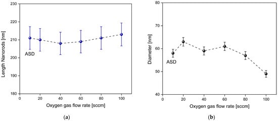 Additionally, the diameter and length of ITO-nanorod structures treated with oxygen plasma at different flow rates were analyzed, and the average values were calculated using Gaussian distribution [41] according to Equation (5).