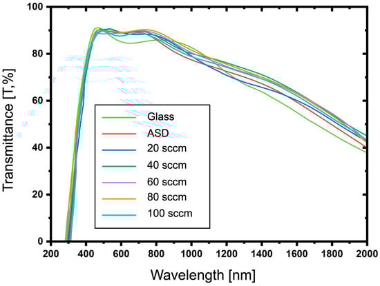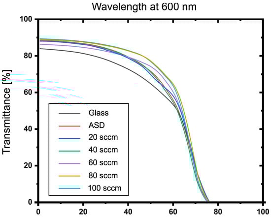 The light transmittance was analyzed by a spectrophotometer measuring from the 250 to 2000 nm wavelength range. The comparison between glass substrate, ASD film, and ITO-nanorod treated with oxygen plasma of varying gas content at 20, 40, 60, 80, and 100 sccm is displayed in Figure 10. From the spectral lines, it was found that the light transmittance of the plasma-treated ITO-nanorod film was in a good range and was close to each other in the visible wavelength range of 380–750 nm, which is the appropriate wavelength. The overall transmittance values are approximately 85%.