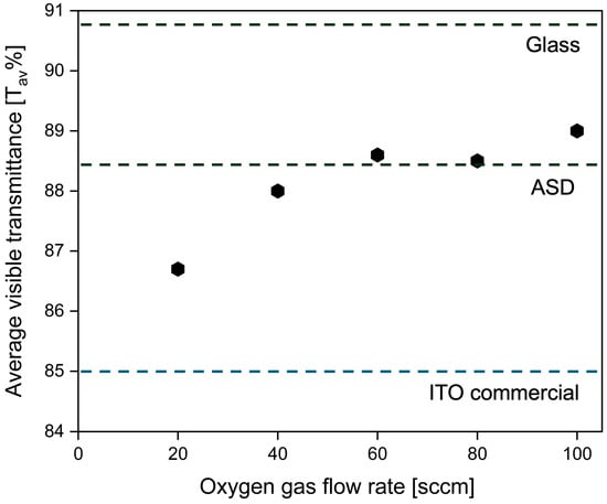 Average transmittance in the visible range of the ITO-nanorod films compared with clear glass, ASD film, and treated with oxygen plasma content of 20, 40, 60, 80, and 100 sccm prepared via bias-magnetron RF sputtering process.