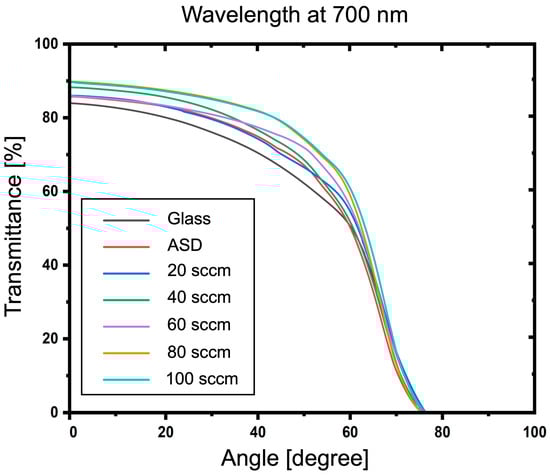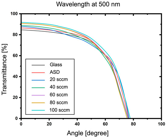 Furthermore, the average transmittance in the visible range (400–700 nm) of ITO-nanorod films treated with oxygen plasma under different gas flow rates of 20, 40, 60, 80, and 100 sccm was calculated and compared with glass, ASD film, and ITO commercial, as shown in Figure 11. As can be seen in the graph, the average transmittance in the visible range of the plasma-treated ITO-nanorod film increases with the increase in the oxygen gas flow rate. Due to the increased self-collision of oxygen ions at higher concentrations, a correspondingly higher average transmittance change is achieved. Then, the omnidirectional characteristics were analyzed at 500, 600, and 700 nm wavelengths of the glass substrate, as-deposited film, and treated with oxygen plasma of varying gas 20, 40, 60, 80, and 100 sccm. It was measured at the incident angle between 0 and 80. The analysis results are illustrated in Figure 12, Figure 13 and Figure 14. From the spectrum, the results found that a percentage of light-transmittance at incident angles of ITO-nanorod treated with oxygen plasma was close in overall cases of gas content. Compared with glass, ITO-nanorod films treated with oxygen plasma have a higher light transmittance. Therefore, optimizing light transmittance value is suitable as a thin transparent conductive oxide film in solar cells.