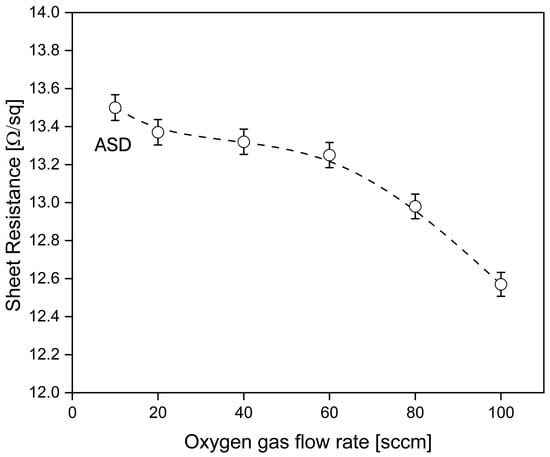 Figure 15 shows the electrical properties of ITO-nanorod treated with oxygen plasma at gas contents 20, 40, 60, 80, and 100 sccm, compared to ASD film. From the electrical properties test results, it was found that when the oxygen gas flow rate increased, the sheet resistance value gradually decreased. It was found that the oxygen gas flow rate of 100 sccm showed the lowest sheet resistance value. On the contrary, the ASD film gave the highest sheet resistance value. In this, the decrease in sheet resistance is because of the bombardment of oxygen ions with the film surface with the highest oxygen concentration. Thus, it has a higher ability to attack the ITO-nanorod film surface, which exhibits the lowest sheet resistance. With this low resistance, ITO-nanorod films will greatly benefit DSSCs, as they will enable efficient charge transfer and reduce energy loss in the cells.