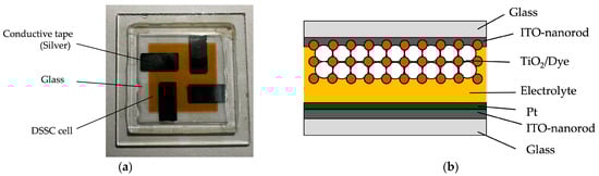 The photovoltaic (PV) performance of the fabricated DSSC devices with the ITO film is evaluated. Figure 16a shows an image of the fabricated ITO-nanorod-based DSSC sample experimentally used in this work. As can be seen in Figure 16b, the ITO-nanorod film is an electron-collecting layer. TiO2 nanoparticles of 15–20 nm size are interconnected in three dimensions on the ITO-nanorod layer. For this, many dye molecules injected into the TiO2 nanoparticle layer will adhere to the large surface of nanoparticles, enabling efficient harvesting. In this work, the TiO2 paste was provided by the sol-gel combustion method with a thickness of 10 μm, which was coated on glass by the screen-printing technique.