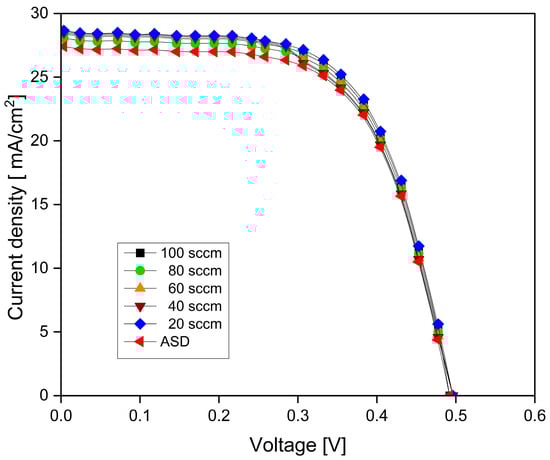 I–V characteristics of DSSCs on ITO-nanorod treated with oxygen plasma of varying gas contents at 20, 40, 60, 80, and 100 sccm provided via bias-magnetron RF sputtering process.