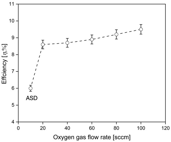Figure 18 shows the overall efficiency of DSSC devices, comparing ASD film and ITO-nanorod film treated with oxygen plasma in different conditions of gas flow rates. The trend illustrates that when the oxygen gas flow rate is increased, the η of the photovoltaic improves. Compared with ASD film, the samples treated with oxygen plasma exhibited higher efficiency, especially at an oxygen gas flow rate of 100 sccm, showing the highest efficiency of 9.5%. It produces higher energy oxygen plasma with more oxygen gas ions. When falling to ITO-nanorod substrates, the substrate surface is modified by enhancing the roughness of the ITO-nanorod (working electrode) to allow greater dye absorption. This results in better light harvesting efficiency, leading to improved performance of DSSC devices based on ITO-nanorod deposited on a glass substrate.