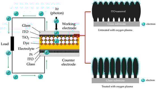 Dye-sensitized solar cells (DSSCs) are among the most widely studied thin-film solar cells because of their cost-effectiveness, low toxicity, and simple fabrication method. However, there is still much scope for replacing current DSSC materials due to their high cost, low volume, and lack of long-term stability. Accordingly, indium tin oxide (ITO)-nanorod films were fabricated by electron (E)-beam evaporation using the glancing angle deposition method in this study. Then, the ITO-nanorod was treated with oxygen plasma via a bias-magnetron radio-frequency (RF) sputtering process to improve the efficiency of DSSCs under a varying gas flow rate of 20, 40, 60, 80, and 100 sccm. The field emission scanning electron microscopy (FE-SEM) investigation of the ITO film structure revealed that the obtained nanorod structures have slightly different diameters. At the same time, an increase in the oxygen flow rate resulted in a rougher film surface structure. In this, the lower sheet resistance was received because of rougher morphology. When comparing the DSSCs efficiency (η) test results, we found that at a gas flow rate of 100 sccm, the highest efficiency value showed 9.5%. On the other hand, the ITO-nanorod without plasma treatment exhibited the lowest η. Hence, plasma technology can be practically applied to improve the η of DSSC devices. This study will be a prototype of a highly advanced solar cell manufacturing method for the solar cell industry.