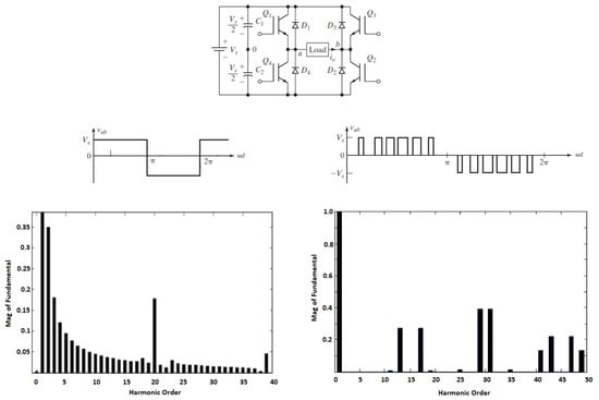 At present, electrical energy from renewable energy sources is one of the main research topics, especially the use of solar energy captured by photovoltaic panels. To integrate this system into the electrical power system, it is necessary to use an inverter and power converters that allow obtaining an AC voltage from a DC voltage; the simplest and most commonly used topology is known as the PWM inverter. It produces a square or quasi-square voltage waveform where the fundamental sinusoidal component predominates, acceptable in low and medium power applications, and the single-pulse PWM has high harmonic content with a THD of 48.43%. Modulation strategies improve the THD in PWM inverter output such as sinusoidal pulse width modulation (SPWM), which reduces the harmonic content using the right filters or switching frequency, and allows voltage amplitude control; however, it increases switching losses, limiting the switching frequency [1,2,3]. THD is an important factor in high-power applications, and harmonics can generate undesired operation effects, electromagnetic interference, and cause low efficiency. In Figure 1, the output waveform and frequency spectrum of a PWM and SPWM inverter are shown; the difference in the harmonic content can be appreciated.