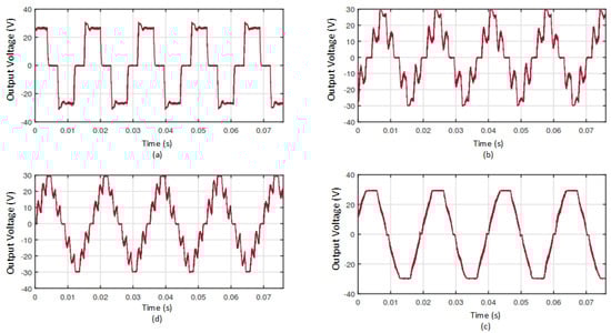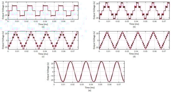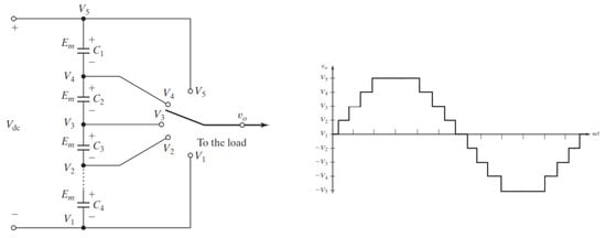 A conceptual topology is shown in Figure 2. The stepped voltage waveform is generated from each energy bank node to a reference node , if , and the positive half period output waveform is generated when switching from to and returning to with appropriate control signals. The negative half period is generated in the opposite way when , and switching starts in [4]. In Figure 2, the output voltage waveform is shown.