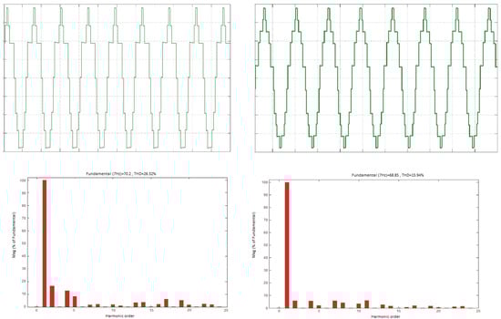 Each wave is analyzed in MatLab to determine the distortion, obtaining the values shown in Table 3, where a decrease in the harmonic content with respect to the increase of levels can be appreciated, obtaining a distortion of for infinite levels and increasing to for three levels. In the case of infinite levels, a low harmonic content is in the third harmonic and less than for the rest. The THD percentage value obtained for infinite levels is within the ranges allowed by IEEE standard 519 [32] for low-voltage applications.