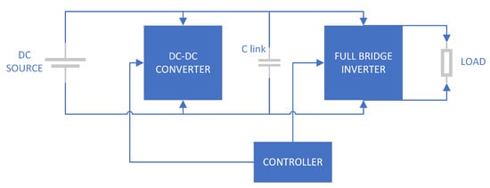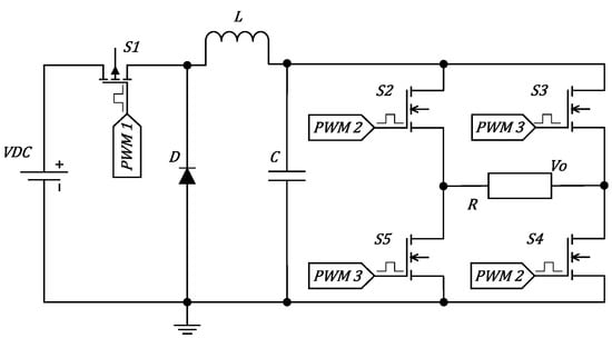 In [11,12], a topology called inifinite-level inverter (ILI) was proposed, where a DC–DC converter was cascaded with a single-phase full-bridge inverter. This topology was mentioned in [13] as a variable inverter with DC link; a stepped wave can be obtained by controlling the output voltage of the DC–DC converter while the inverter switches its switches in conduction at 180°. A topology scheme is shown in Figure 4. Through this type of operation, an infinite-level inverter can be obtained, where several levels can be reached with fewer electronic devices, reducing losses, costs, size, and complexity, and increasing efficiency.