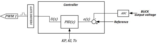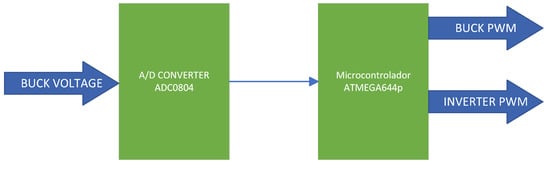 The controller is the logic circuit that generates PWM signals to trigger power switches in the DC–DC converter and inverter in open- and closed-loop operation. The control program is implemented in an ATMEGA644 microcontroller from Microchip Technology Inc. (Chandler, AZ, USA), and an ADC0804 digital analog converter from Wolg Electronics (Kastl, Germany), with a voltage divider is used for feedback for the BUCK output voltage. Figure 7 shows used elements and their connections. Although there are embedded systems with better characteristics for power electronics, the ATMEGA644 microcontroller is used to explore its behavior in digital compensator implementation for power electronics as part of the research of this paper.