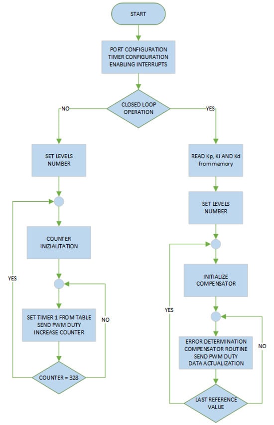 The developed program allows us to choose the number of levels for the inverter output voltage waveform, then the value of the BUCK PWM duty ratio and its duration is calculated using the number of levels and output frequency. For the full-bridge inverter, a PWM with constant duty ratio for 180° operation is generated. In closed-loop operation, PID parameters are from memory, the BUCK output voltage error is calculated, and it executes the compensator routine to control the BUCK duty ratio. A program flowchart can be seen in Figure 8.