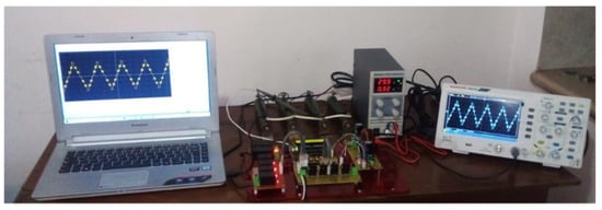 To obtain data for open- and closed-loop evaluation of the BUCK converter within the infinite-level inverter, the circuit described in this section is implemented, the output voltage is analyzed and recorded using an oscilloscope, with numerical storage capability, and then the data are analyzed with the FFT powergui tool of the simscape library of MATLAB R2023b. Figure 10 shows the implemented hardware.