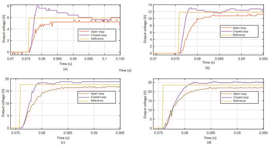 BUCK converter in closed- and open-loop operation for different voltage references: (a) 5.88 V, (b) 11.76 V, (c) 17.64 V, and (d) 23.52 V.