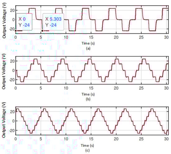 Results in an infinite-level inverter in closed-loop operation for (a) 3 levels, (b) 5 levels, and (c) 7 levels with 2200 F.