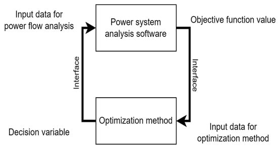 The applied optimization procedure is presented in Figure 1. It represents a co-simulation methodology that interfaces an optimization method with a power system analysis program. In this setup, the optimization method generates a set of decision variables, which serve as input for the power system analysis program. These decision variables may include variables such as PV power plant set points, load allocations, or other controllable variables related to the power system. Once these inputs are processed, the power system analysis program performs power flow analysis, simulating the power system’s response to the obtained inputs. This simulation produces results that reflect the power system’s operational state, such as voltage levels, power losses, system stability metrics, etc. The resulting data from this simulation represent the objective function value, which is then returned to the optimization method. The optimization method uses this objective function value to assess the effectiveness of the current set of decision variables, iteratively testing the variables until convergence ensues. Convergence depends on settings for the optimization method, and it is usually chosen by the trial-and-error method. Because this approach incorporates AC power flow simulations, it provides a comprehensive and realistic representation of the power system’s behaviour, thereby enhancing the reliability and accuracy of the results. Since the optimization problem is presented as an optimal-power-flow-based problem, it is defined as nonlinear and nonconvex, which means it is hard to solve with an analytical optimization method. Otherwise, the original problem should be transformed to a level where the analytical method can be applied. These procedures reduce the degree of accuracy of the optimization model.