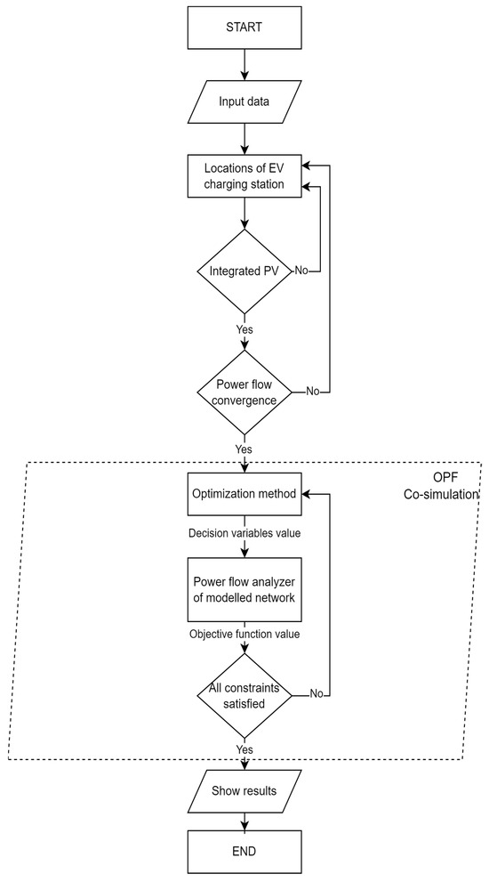 Figure 2 illustrates a flowchart diagram derived from the proposed optimization framework. Solar irradiance, EV charging pattern, loads, and network parameters represent inputs for the optimization procedure. Decision variables are obtained by the optimization process and represent the input for power flow analysis, which gives the objective function value as its output. If the obtained objective function values satisfy all constraints, the optimization procedure ends. Otherwise, the whole procedure is repeated.