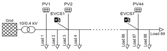 The EV charging stations are integrated into the grid according to the optimization procedure as three-phase 11 kW symmetric active power loads (P_EVCS = 11 kW). The integration of the EV charging stations at the nodes in the low-voltage grid where PV systems are already installed is supported by the tariff system (Croatia, European Union), which promotes efficient energy management based on the same location of generation, consumption, and storage of the electrical energy [29].
