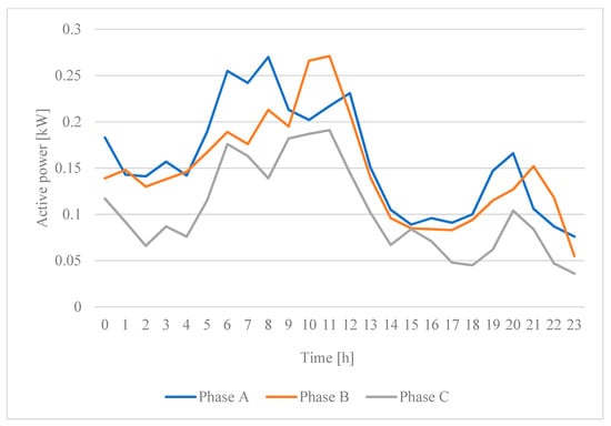 The proposed optimization procedure was examined using a realistic low-voltage urban distribution grid (radial low-voltage feeder) modelled in DIgSILENT Power Factory 2022 software (Figure 3). The grid consists of 89 household consumers with PV systems installed on roofs and is connected to the superior-10 kV grid via a 0.63 MVA 10/0.4 kV transformer. The single-phase PV systems with an apparent power of 3.68 kVA are connected to approximately every second consumer node, while the three-phase PV systems with an apparent power of 10 kVA are connected to nodes 2, 20, and 28, respectively. The PV generation curve(s) (Figure 4) were determined by continuous power quality measurements over a period of 24 h in summer weather conditions (early August in the Central Europe South area) at a consumer node with an installed PV system [28]. The consumer load characteristic is determined within 24 h power quality measurements at several consumer nodes [28]. Since the load patterns for households do not differ significantly, the load curve resulting from averaging all of the measured values for each hour was adopted for all consumers (Figure 5).