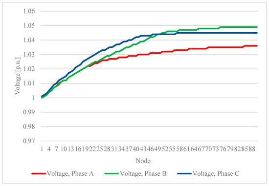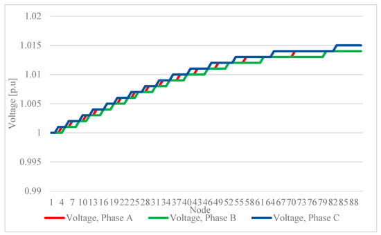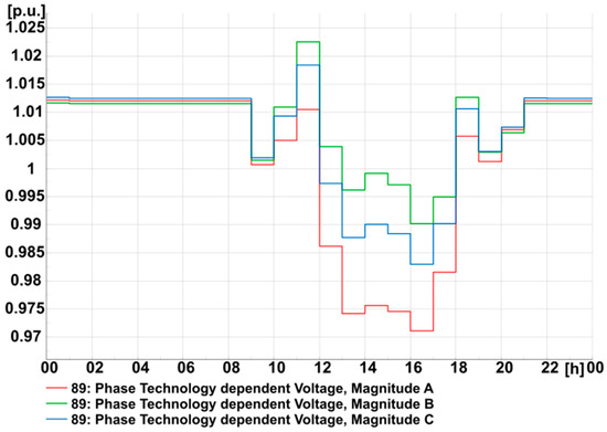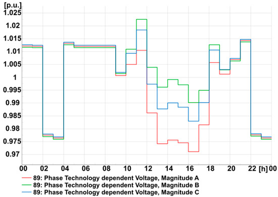 The highest voltage value—1043 p.u.—occurs during the daily generation peak at node 89. However, the voltage is within the specified limits for all three phases, with the lowest value during the night (Figure 7). However, the lowest value is 1 p.u., which is a preferable value.