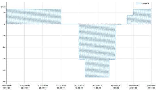 As can be seen from Figure 8, most of the PV generation in the baseline scenario was exported to the superior-10 kV grid; the high PV generation resulted in a voltage increase at node 89. Therefore, the total consumption of the low-voltage grid is increased by integrating EV charging stations in this operational scenario. The locations of integration and the charging curve are determined following the optimization procedure and constraints set in Section 2.1, which implies the minimization of energy exchange with the superior-10 kV grid while keeping the voltage values within the specified limits. The optimization procedure indicates that preferable locations for integration of EV charging stations are nodes 4, 16, 28, 40, 52, 60, and 88, with no additional constraints. Each EV battery has capacity of 70 kWh, which was obtained by directly surveying owners of EVs by the authors of [30]. The charging curve is shown in Figure 9. Positive values indicate the period when the battery provides energy to the network, while the negative period is the battery charging time.