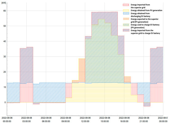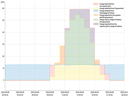 Energy exported to the superior-10 kV grid is marked in blue, while the red area is the energy supplied by the grid. Red and blue characteristics represent EV charging from the superior grid. PV production is marked in yellow. During the maximum generation period, the EV is charged and the energy used for the charging is marked with blue and yellow. Since charging EV and PV generation profiles do not match completely, between the 12th and 18th hour, batteries are charged from energy taken from the external grid (red and blue characteristic).