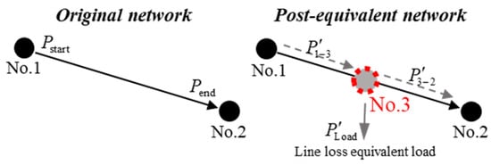 The ADN’s voltage levels are low, and the total share of electric energy lost in the lines is large and often non-negligible []. The above carbon potential calculation method does not consider the power loss in the lines. Therefore, we add virtual loss nodes in the middle of each branch for the ADN to transform the lossy network into a lossless network.