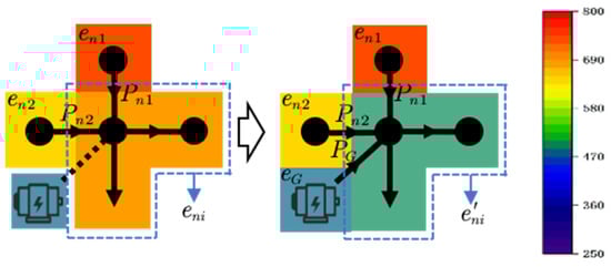 As shown in Figure 3, when the outflow of node i connected to the generating equipment is fixed, the larger the difference between the original node carbon potential and the carbon emission factor of the generating equipment, or the larger the injected power of the generating unit, the larger the change in the node carbon potential before and after. Therefore, the operation status can be judged according to the carbon potential difference of the nodes: when the node carbon potential is higher than the carbon emission factor of the generating unit, the carbon emission intensity at the node load is reduced by increasing the input power of the generating unit.