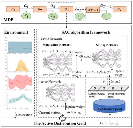 In the actual operation situation, the environmental stochasticity makes it difficult to establish an accurate model; we propose the use of the improved Soft Actor–Critic (SAC) algorithm to solve the above MDP problem []. The overall structure is shown in Figure 4.