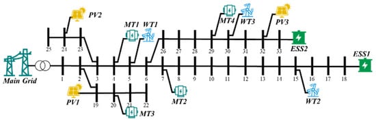 In order to validate the effectiveness and advantages of the low-carbon dispatch methodology proposed in this paper for active distribution networks, it is validated on a modified IEEE 33-bus system. The node system is shown in Figure 5, with WTs at nodes 5, 15, and 30, photovoltaic arrays at nodes 19, 24, and 32, dispatchable gas-fired units at nodes 4, 11, and 29, and electrical energy storage devices at nodes 18 and 33. The operating parameters of the devices are shown in Table 1.