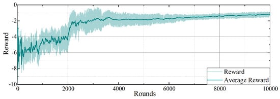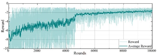 The convergence trend of the average reward curve obtained during training is an important indicator for evaluating the performance of deep reinforcement learning algorithms. Figure 6 shows the training process curves of the intelligence using the original reward function in 10,000 rounds of training. We use the linear sum of the objective function and the normalized penalty term as the original reward function. Meanwhile, the change curve of the reward value of the improved algorithm proposed in this paper is shown in Figure 7.