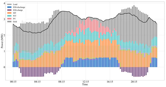 where PMT(t), PPV(t), and PWT(t) are the total output power of gas turbine, photovoltaic, and wind turbine at time t; PESS(t) is the total power of energy storage equipment; PLoad(t) is the total load of distribution network.