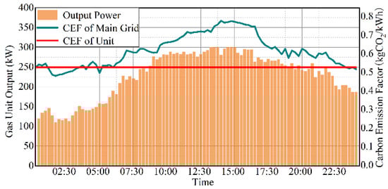 The change in the operating status of 1# gas unit under the change in carbon potential of the main grid is shown in Figure 9. When the carbon potential of the main grid is lower than the carbon emission factor of the gas unit, such as during the 0:00–7:00 time period, the output power of the gas unit is lower, mainly playing the role of regulating the stable operation of the distribution network. When the carbon potential of the main grid is higher than the carbon emission factor of the gas-fired units, such as during the 10:00–17:00 time period, the gas-fired units are used to replace part of the main grid power input, and at this time, under the fixed load and storage demand, the gas-fired units have a better low-carbon benefit compared with the main grid transmission of the same amount of electricity, and thus the unit output power increases.