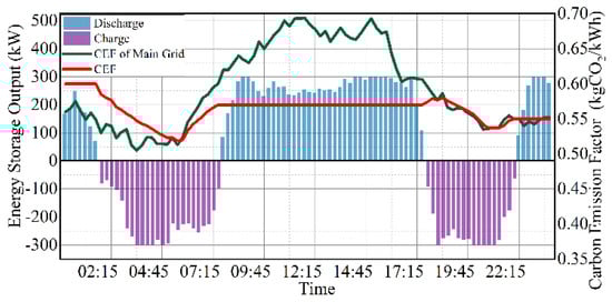 Figure 10 shows the scheduling results of 1# energy storage equipment under the change in carbon potential of its connected 3# node, setting the initial 2 of the energy storage equipment as 80%, and the initial carbon flow rate as 0.6 kgCO2/kWh. In the initial stage, the energy storage equipment discharges continuously in order to respond to the high load demand of the distribution network, and when the load demand decreases, and the node carbon potential is lower than the carbon emission factor of the energy storage equipment, such as in the time period from 1:45 to 7:30, the energy storage equipment changes to charging state and absorbs the low-carbon power from the distribution network, and its discharge carbon emission factor is calculated to be 0.57 kgCO2/kWh at the end of the charging state based on the changes in the nodal carbon potential and charging power in the model of Equation (9). When the load demand increases, such as 7:45–17:30, the energy storage device continuously discharges and outputs the low-carbon power stored in the previous charging state, and the carbon emission factor of the discharge is 0.57 kgCO2/kWh, which is lower than the node carbon potential, thus realizing the effect of reducing carbon emissions.
