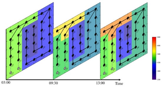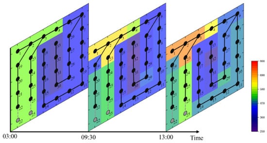 The 33-node distribution network is plotted as a 6 × 6 grid diagram, which represents the distribution of nodal carbon potential at a certain moment in time, and the color represents the numerical level of nodal carbon potential. Figure 11 shows the distribution of nodal carbon potential at different times of the distribution network without considering the dispatch of gas units and energy storage devices. Figure 12 shows the distribution of carbon potential in different time periods using the proposed model and the optimal operation strategy. Comparing the two figures, it can be intuitively seen that this method reduces the overall carbon potential during active distribution network operation, expands the radiation range of zero-carbon emission energy sources such as wind and photovoltaic, and improves the utilization rate by controlling gas-fired units and energy storage devices in response to the new energy output and the high carbon and low carbon changes in the main network.