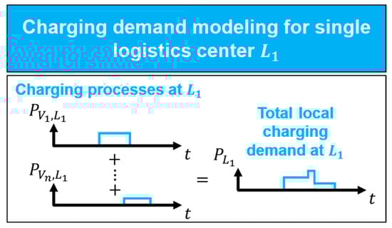 For category 3, the determination of the charging demand is not focused on the individual vehicles, but on specific charging locations, such as depots or hubs on highways. In the context of this paper, these approaches are called location-based. Location-based charging profile modeling approaches quantify the charging demand based on the arrival behavior of conventional vehicles at these locations combined with mobility behavior and vehicle parameters of electric vehicle models. Approaches of this kind transferred to electric trucks can be found in [,,]. Despite different implementations of the modeling, in the literature, location-based approaches are usually applied only to individual charging sites: in [], these sites are two logistics business parks, and in [], one real logistics center. This is also due to the high diversity of the logistics industry, which makes the development of transferable approaches particularly complex.