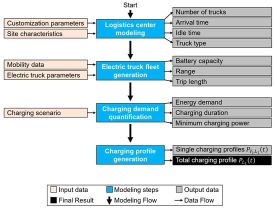 The charging profile modeling of electric trucks at logistics centers can be divided into four steps: