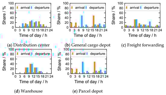 Overview of the arrival and departure behavior of trucks at the different types of logistics centers. The proportions of arriving and departing trucks are shown in three-hour intervals (data based on [] combined with own assumptions).
