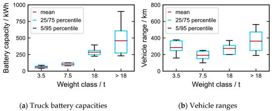 Overview of the battery capacities (a) and range (b) of trucks of different weight classes based on a market analysis (data from []).