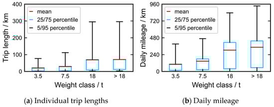 Overview of the lengths of individual trips (a) and the daily mileage (b) of trucks of different weight classes based on data from Motor Vehicle Traffic in Germany surveys [,].