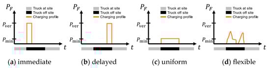 Comparison of single charging profiles for different charging modes considered: immediate charging (a), delayed charging (b), uniform charging (c), and flexible charging (d).