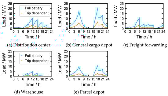 Figure 7 shows the weekday load profile of truck charging demand at the different logistics center types for uniform charging. A distinction is made between the recharging scenarios of full charging and last trip charging.
