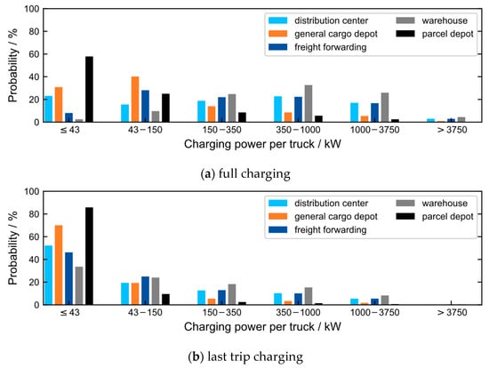 Probability distribution of the minimum charging power needed per truck at the different logistics center types for full charging (a) and trip-dependent charging (b).