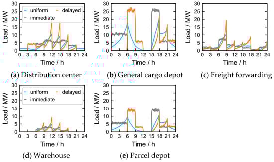 Although uniform charging during a truck’s stay, as discussed in the previous section, is helpful for estimating the minimum charging power required, in reality, it does not occur as standard. This is due to the fact that for uniform charging, a charging connection must be provided for each vehicle for the entire duration of its stay. At the same time, the vehicle’s charging demand must be known from the outset in order to adjust the charging power accordingly. In order to further restrict the value range of the load profile from reality, immediate and delayed charging are examined here. With immediate charging, the vehicle starts directly on arrival with the maximum available charging power and recharges based on demand as quickly as possible. With delayed charging, on the other hand, the charging process is started as late as possible so that the charging process finishes exactly on departure. Figure 9 shows the results of these two charging modes in comparison to the uniform charging previously considered. Only the full charging scenario is shown. As a maximum scenario, it was assumed that each vehicle can recharge with the maximum of the megawatt charging standard of 3750 kW. This means that hardly any charging process prolongs the downtime at the logistics center. The effects of the different charging modes on the load profiles vary. At centers with many distributed charging processes during the day, such as the distribution center, warehouse, and freight forwarding center, immediate charging results in less simultaneity in the charging processes, and thus lower peak loads than with uniform charging occur. At the general cargo depot and the parcel depot, a large number of trucks arrive and depart at the same time, which means that both immediate charging and delayed charging cause high peak loads due to high simultaneities. In general, it can be seen that the charging mode can have a strong impact on the load profile. However, this also creates new flexibility potentials at the logistics centers that can be used. At best, the charging load profile is adapted to the conventional load profile of a logistics center and to any local generation. The next subsection will therefore take a closer look at the time-shift potential of the load profiles.