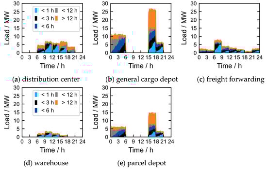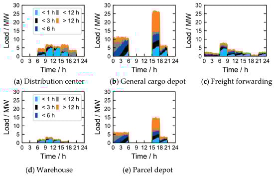 The results of the previous sections have shown that charging electric trucks at logistics centers can cause new peak loads at these locations. The extent to which these new loads can be flexibly adapted is of interest with regard to the appropriate dimensioning of the grid connections, but also taking into account the increasing flexibility potential in the electricity grids. By knowing the idle time of the trucks at the logistics centers as well as the necessary charging time at fixed charging powers, the charging demand modeling approach allows an analysis of the temporal shift potential of the charging loads. Figure 10 shows the time-shift potential of the cumulative charging loads for immediate full charging. The portions of the weekday load profiles that can be shifted by a certain period of time are colored. The consideration of individual charging powers of 3750 kW allows an outlook on the maximum available flexibility potential. At lower charging powers, as shown in Figure 11, the flexibly shiftable proportions of the charging loads decrease accordingly. High flexibility potentials can be seen at the general cargo depot and the parcel depot in particular. This is due to the idle times of the trucks arriving there overnight. Half of the peak load between 3 p.m. and 6 p.m. can be shifted by more than 12 h. Only a very small proportion of the load between 3 p.m. and 9 p.m. cannot be shifted.