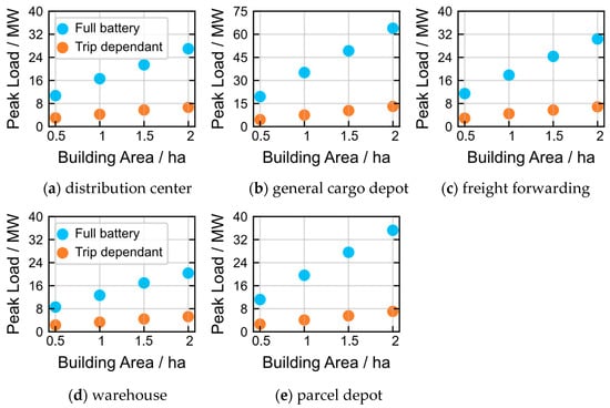 Even if the location-based charging demand modeling approach for electric trucks at different logistics depots can be adapted to the characteristics of individual depots, its detailed modeling is not always suitable in practice. For power system planning by grid, it is often sufficient to assume peak loads, possibly with knowledge of their probability of occurrence. In this paper, therefore, easily applicable peak loads were derived from the weekday load profiles. Here, full charging and last trip uniform charging are considered. Figure 12 shows an overview of the mean weekday peak loads occurring per logistics center type and building area. Depending on the type of logistics center under consideration and its building area, the appropriate peak load value can be read from the graphs.