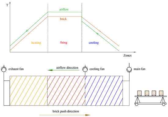 A schematic view of a fast-firing single-layer kiln design is depicted in Figure 1. The single layers of bricks are arranged in rows in kiln cars and are continuously transported through the heating and cooling zones until the firing process is finished. The most important external heat transfer mechanism is forced convection by airflow in the counter direction. The kiln length is usually around 150 m with a width of approximately 5–6 m.