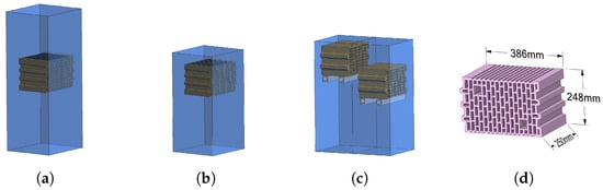 The basic idea is to investigate how different strategies to reduce the airflow area affect the heat transfer. Therefore, three different settings are investigated, as shown in Figure 2. In Figure 2a, the initial setup with a total height of 1.095 m, in which measurements are performed (large setup), is shown. Meanwhile, Figure 2b shows the experimental setup with a reduced ceiling height (small setup) of around . The setup with the staggered arrangement of the bricks (offset setup) has a slightly reduced height (14%) and is shown in Figure 2c.