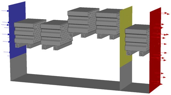 Figure 3 depicts the computational domain with the inlet in blue, the outlet in red, the walls in gray, and an evaluation plane in yellow. Due to the kiln’s length and the complexity of the burning process, a reduced model accounting for only a section of one kiln car is used. The first approach was to model only one brick, which significantly overpredicted the heat transfer values due on an insufficiently resolved flow field [20]. The flow around the bricks is influenced by fluid barriers and the distance and operation of the burners. Therefore, it was decided to model the boundary conditions of a four-brick setting to simulate the movement through the different burning zones, which always resembles the worst-case situation in the kiln. A section of four bricks is used to evaluate the results, as a flow barrier is placed after every fourth brick, creating a periodically repeating arrangement. The fifth brick is included to prevent any influence on the evaluation plane by the boundary conditions of the outlet.